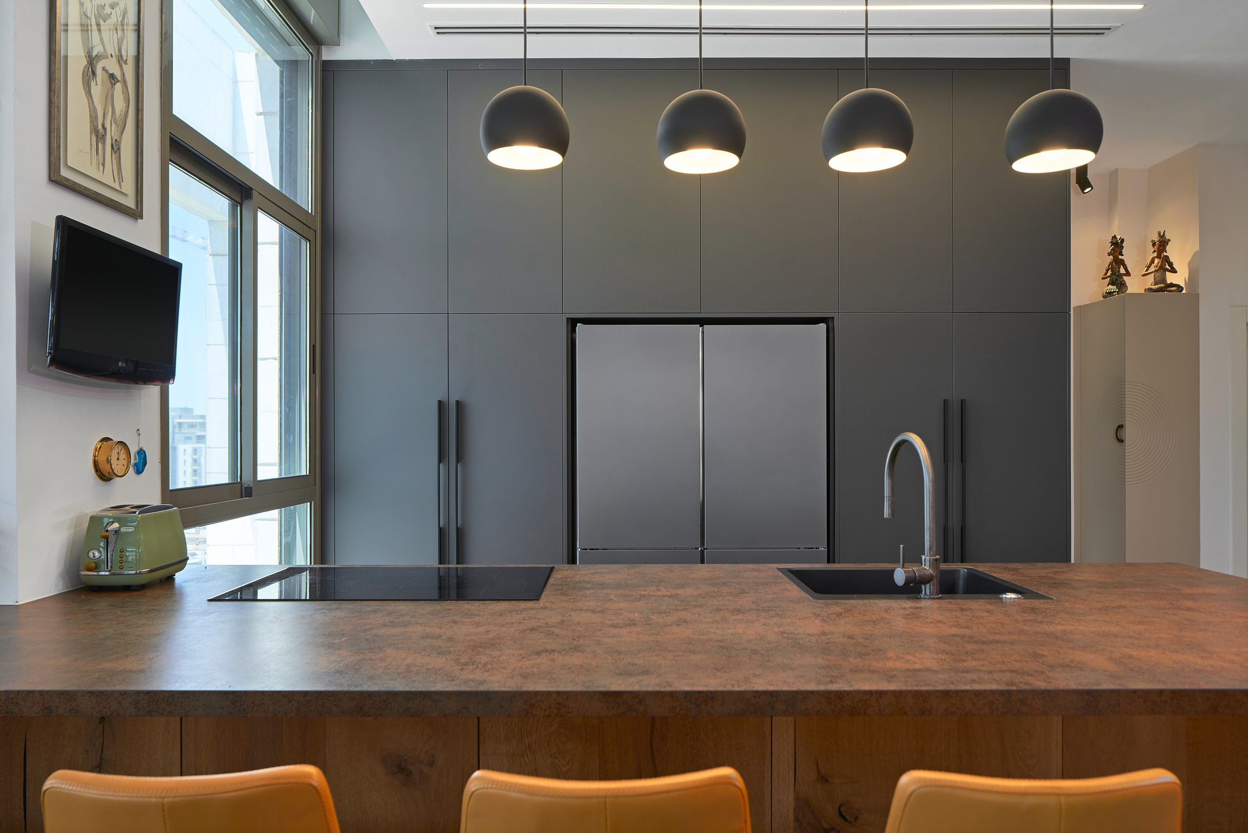 הכיור שעיצבנו במיוחד, יצוק בנוסחה ייחודית של בטון, בהשראת הקינצוגי היפני – תורת איחוי השברים בזהב, מסמל את החיבור של שני האנשים שיצרו חיים של יחד.