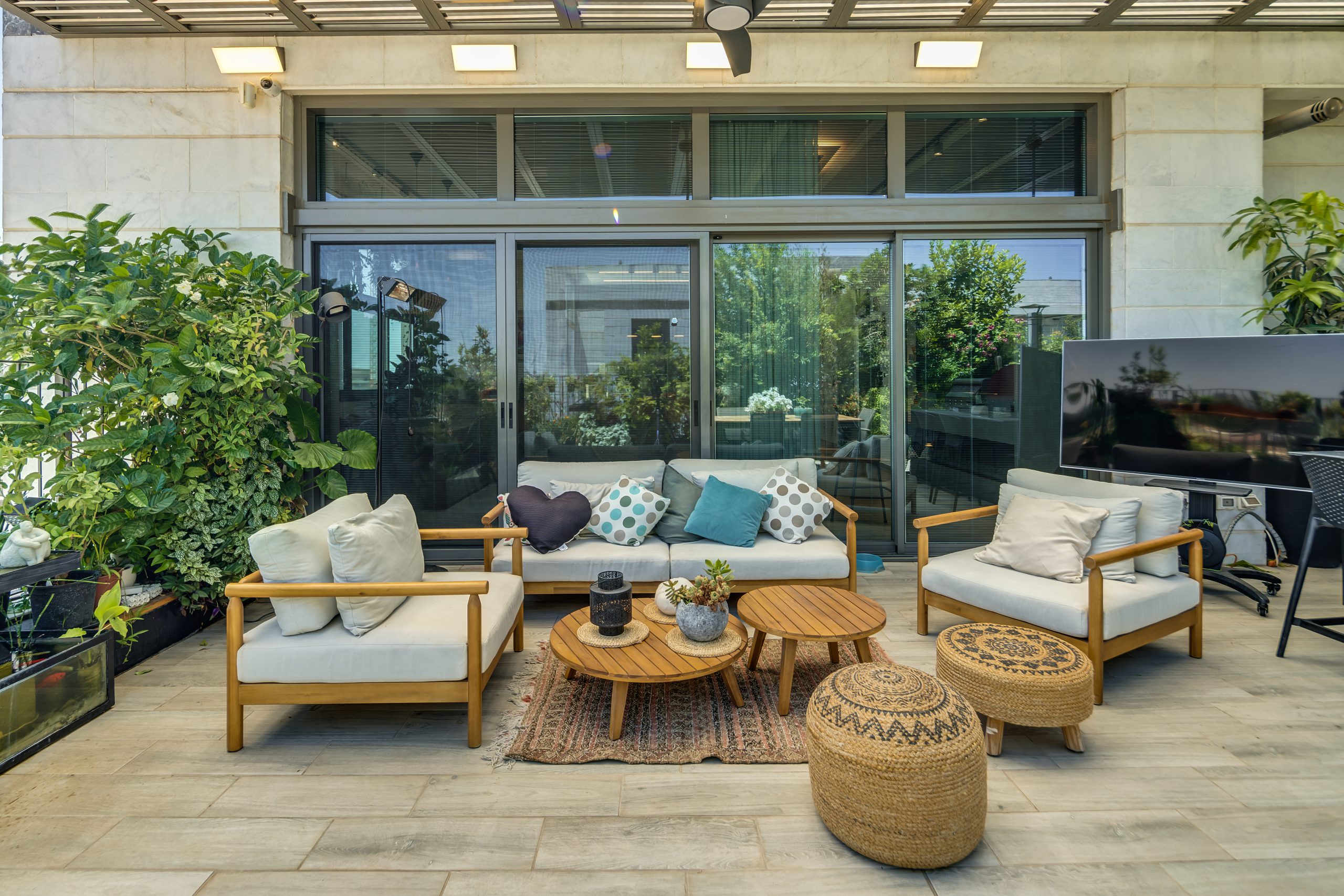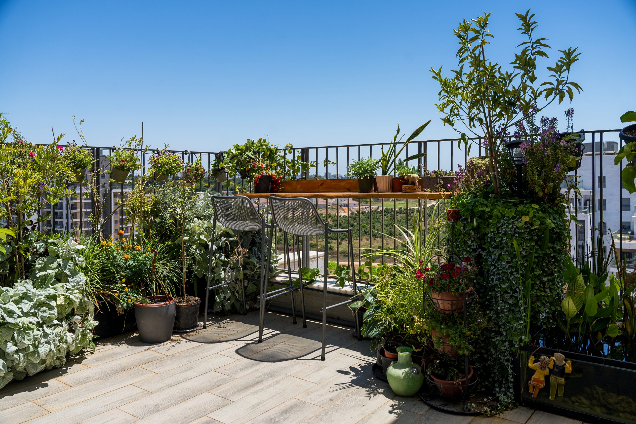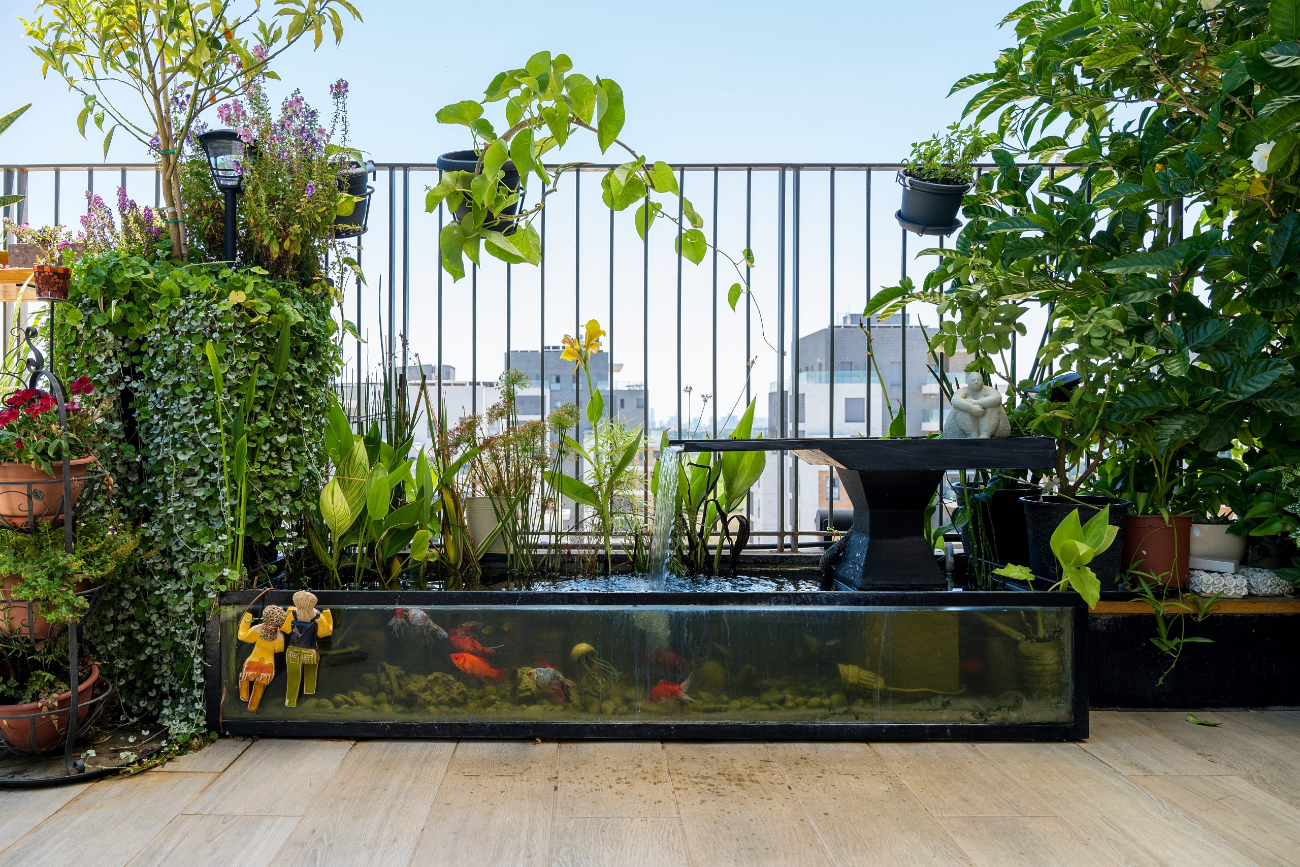 המרפסת היא גן עדן של פרחים ועצי פרי, פורחת ומניבה כל השנה, עם בר מול הנוף הפתוח ואלמנט מים עם דגים בעיצוב אישי ייחודי.