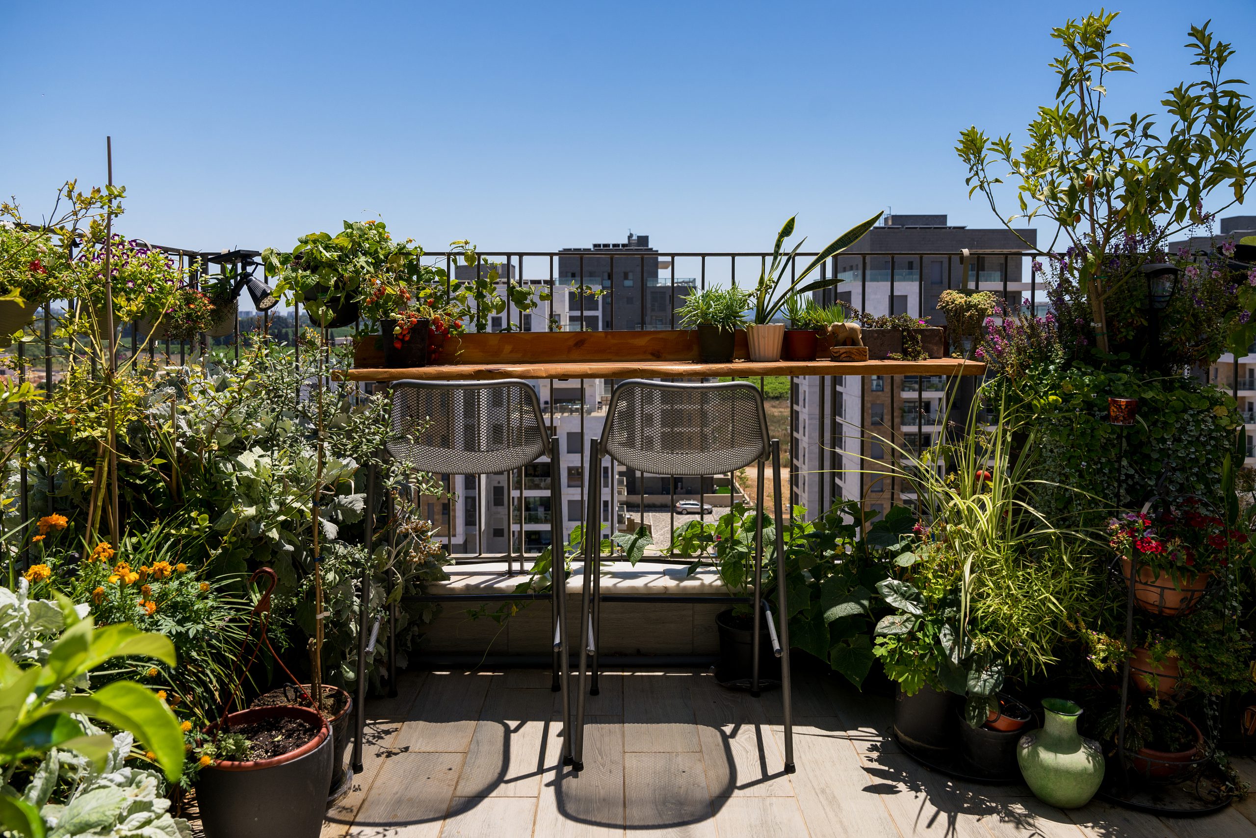 בפינת האוכל במקום וילון מעל החלון הרחב הותקנה רשת צמחיה מלאה בצמחים מטפסים וגולשים, ואפילו במקלחת גדלים צמחים.